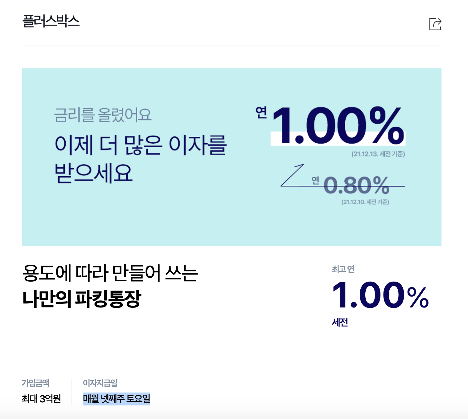 대부분의 파킹통장이 일정 금액 한도까지만 최고 금리(우대 금리)를 주는 경우가 대부분이기 때문입니다.