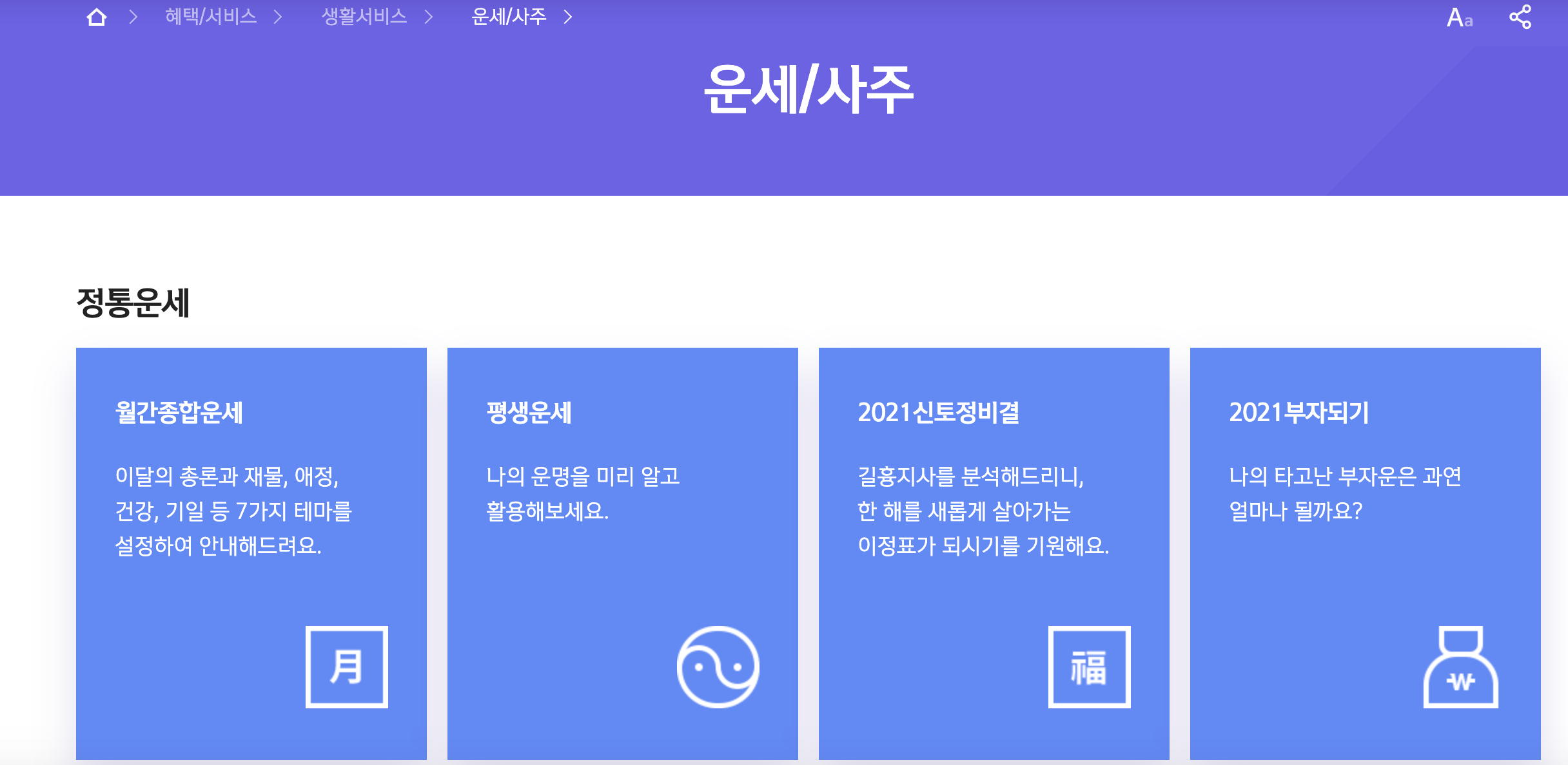 그리고나서 아래쪽을 보면 생활서비스(운세/사주)가 보입니다.