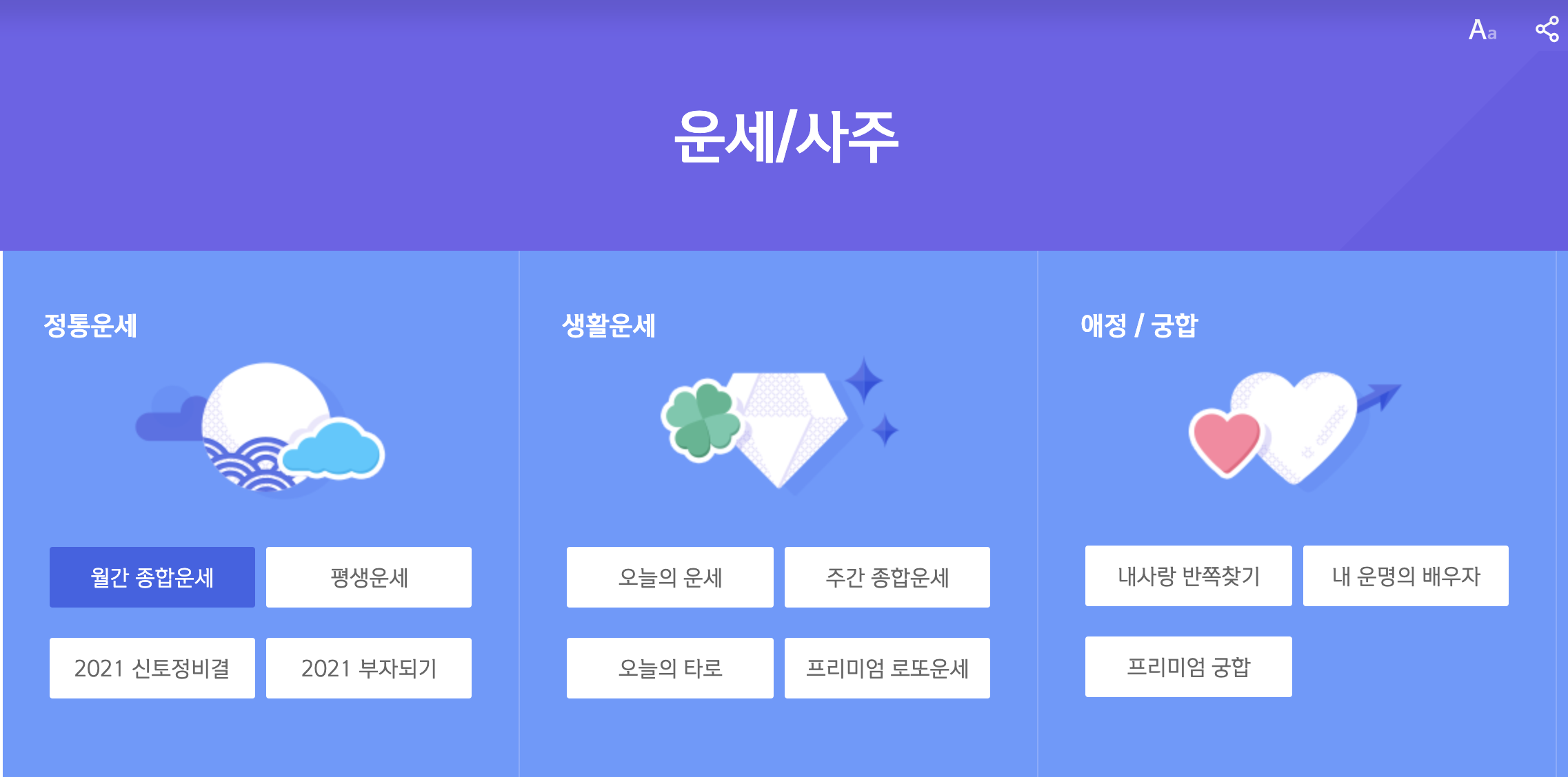 (월간종합운세, 평생운세, 신토정비결 등의 운세 서비스)