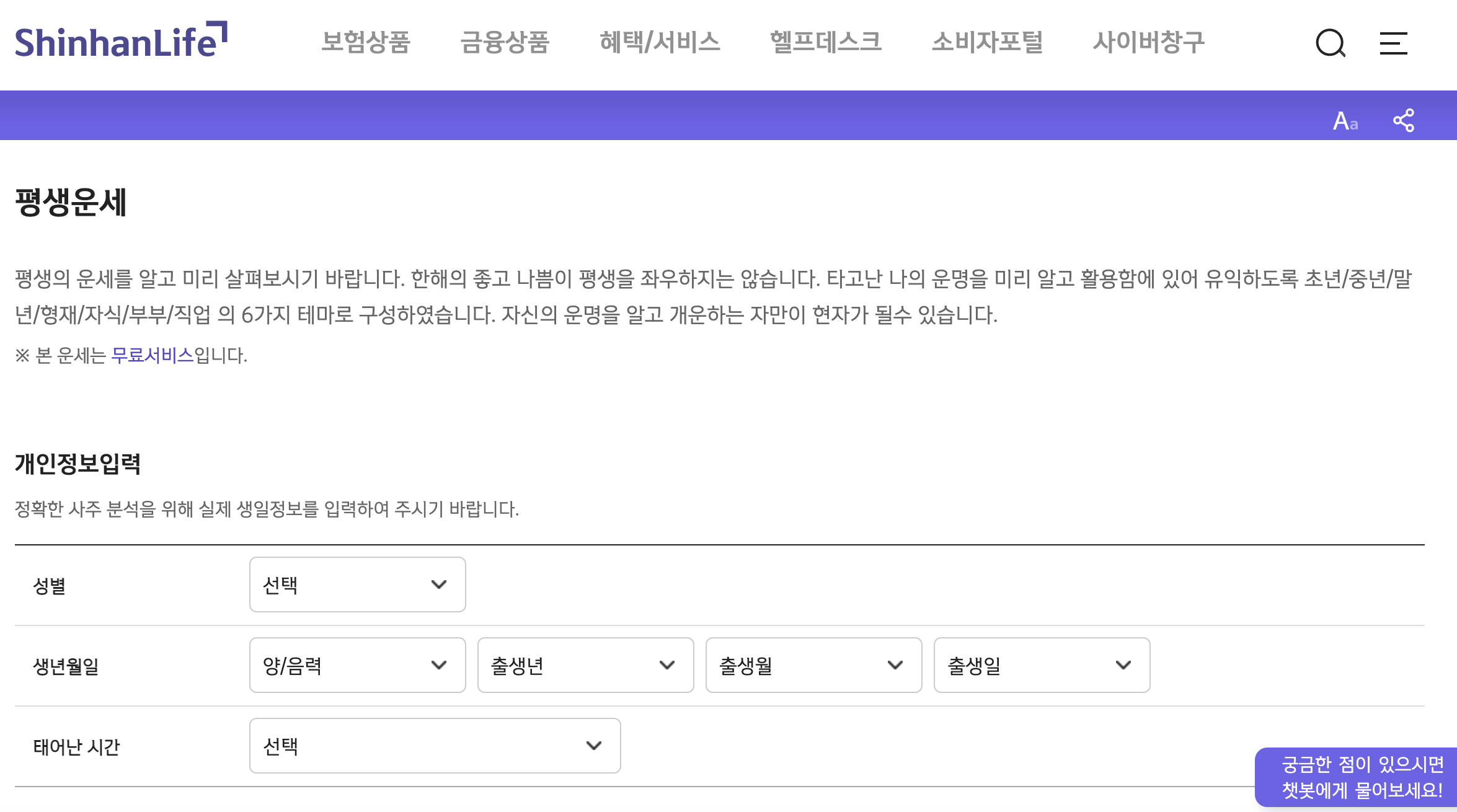 신한생명 홈페이지(신한라이프 홈페이지)에 접속하면 무료운세와 무료사주 서비스를 제공하고 있습니다.