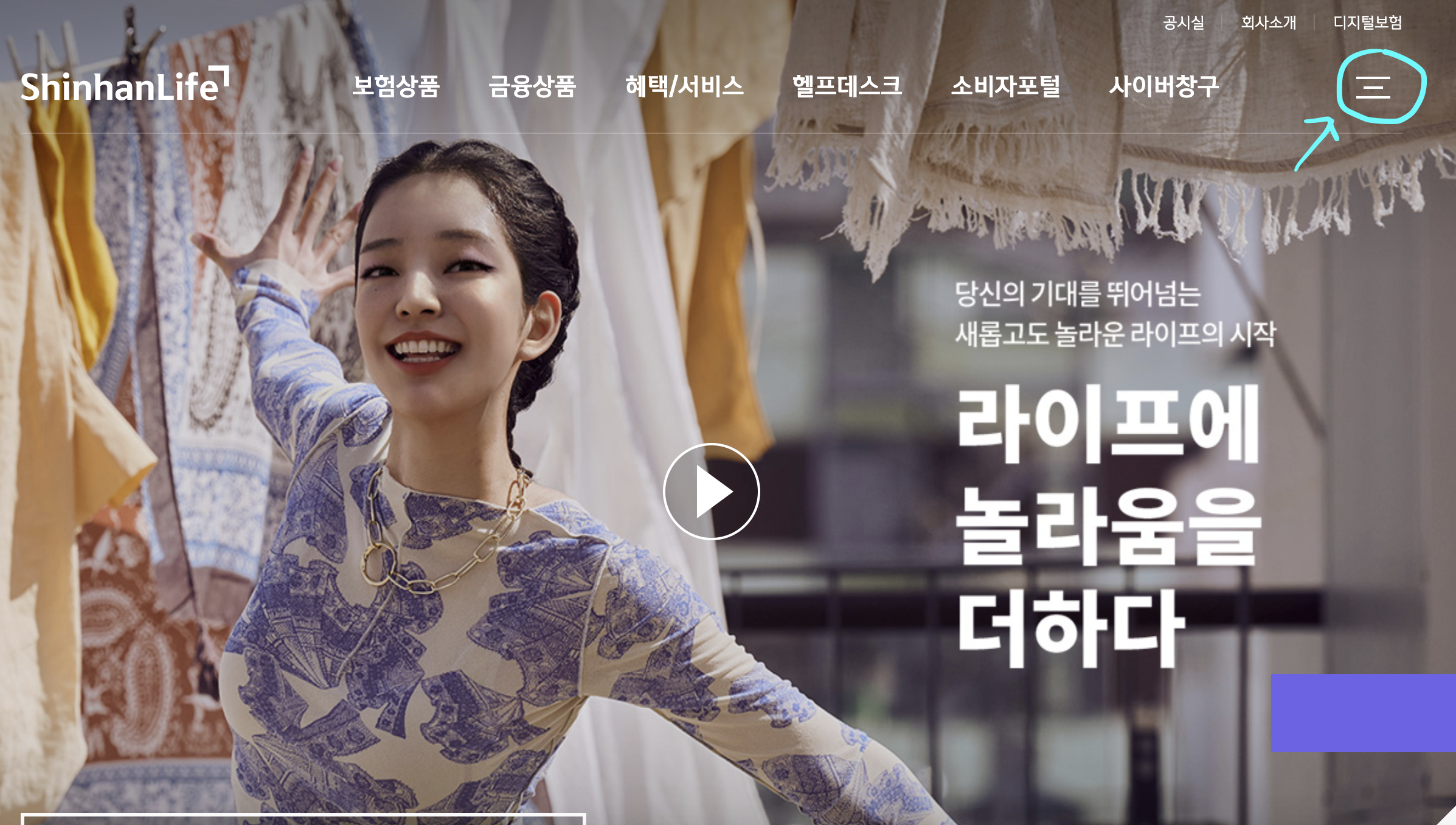 신한라이프(이름 바뀜) 홈페이지 접속 후, 우측 상단에 메뉴를 누르면 해택/서비스 카테고리가 보입니다.